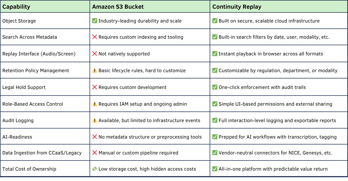 It’s is an excellent storage solution, but when it comes to interaction data in an S3 bucket, storage is only half the equation. You need a way to make that data usable, searchable, compliant, and actionable. That’s where purpose-built platforms make the difference.